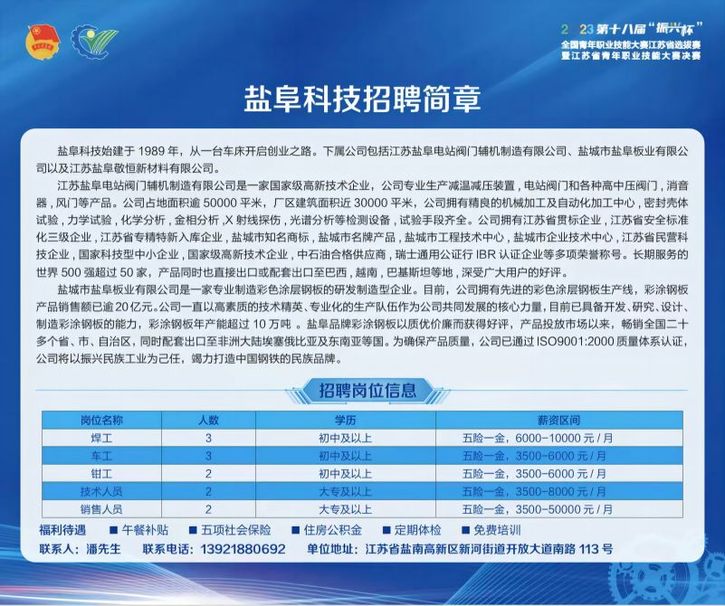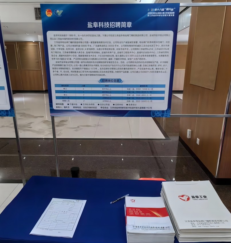 江蘇鹽阜電站閥門輔機制造有限公司受邀參加了第十八屆“振興杯”全國青年職業(yè)技能大賽供需對接會,并在對接會中發(fā)布了數(shù)條招聘崗位。200多名參賽選手、求職學(xué)子參加對接會,現(xiàn)場共有30多名學(xué)生與用人單位簽訂了就業(yè)意向書。